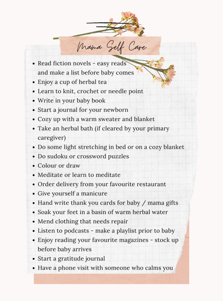 So before your baby arrives, it’s super important to start preparing yourself for this restful state. Let go of any expectations or pressure you may be putting on yourself to ‘get your routine back’ once your baby is born. Be prepared to allow yourself to sink into the newborn stage, forget about the clock and just focus on healing and adapting. If this is not your first baby, see if you can prepare childcare for your others so you can have some of this uninterrupted rest / healing time.